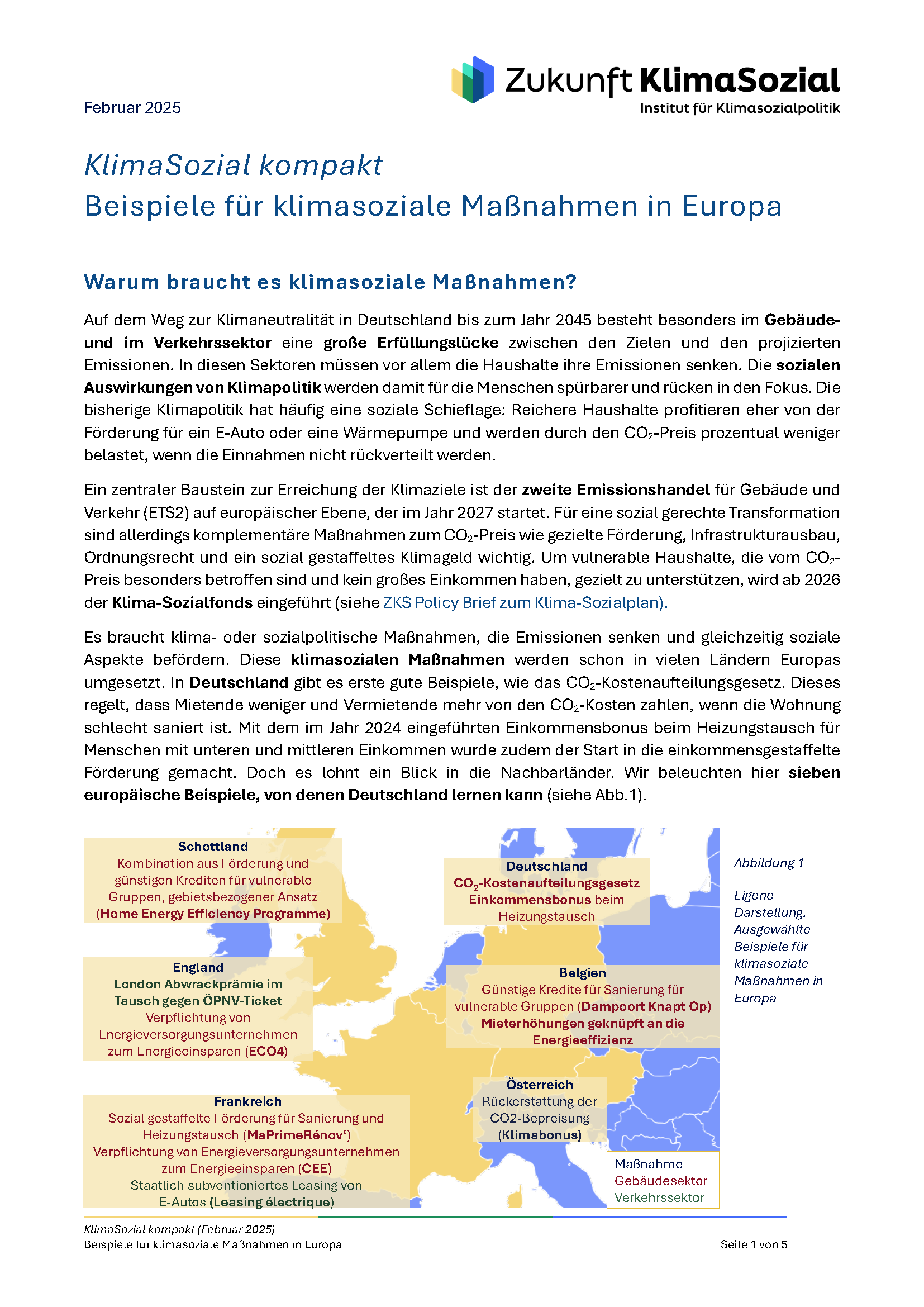 Es braucht mehr klima- und sozialpolitische Maßnahmen, die Emissionen senken und gleichzeitig soziale Aspekte befördern. Diese klimasozialen Maßnahmen werden schon in vielen Ländern Europas umgesetzt. Wir haben in unsere Nachbarländer geblickt und stellen in unserem KlimaSozial kompakt sieben europäische Beispiele vor, von denen Deutschland lernen kann.