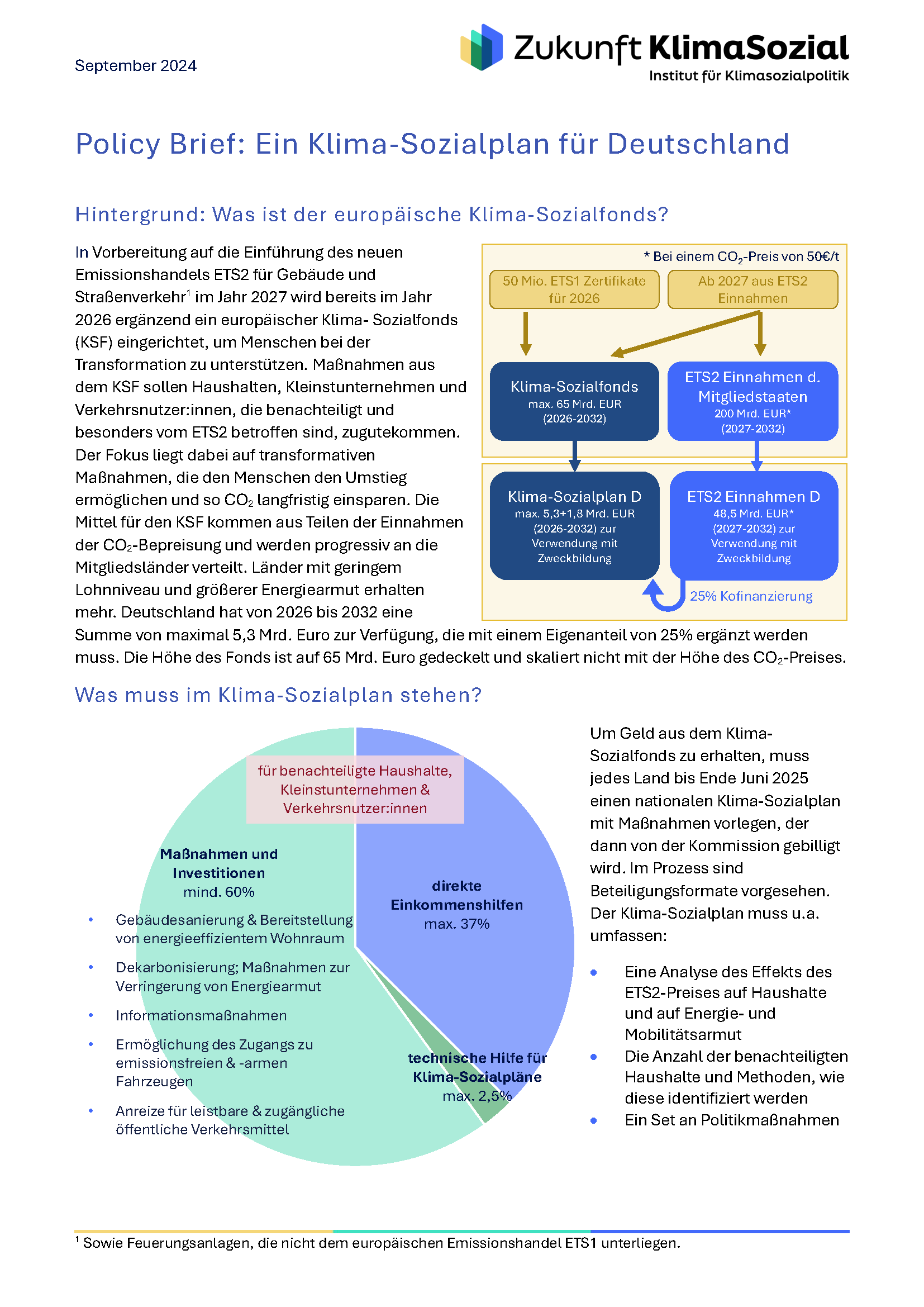 Bis Ende Juni 2025 muss die Bundesregierung einen Klima-Sozialplan für den europäischen Klima-Sozialfonds vorlegen. Was der europäische Klima-Sozialfonds ist und was aus unserer Sicht im Klima-Sozialplan stehen muss, lesen Sie in unserem Policy Brief.