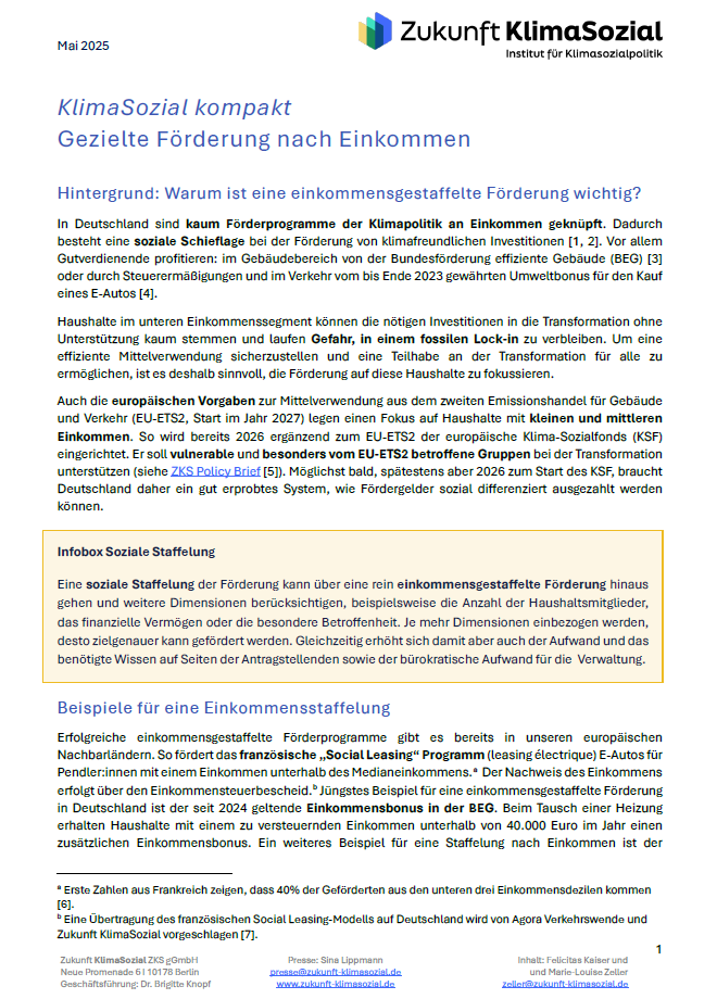 In unserem aktuellen „KlimaSozial Kompakt“ zeigen wir, wie sozial gestaffelte Entlastungen und Förderungen ausgestaltet werden können. Dazu gehören ein einheitlich definiertes Einkommenskonzept, der Aufbau eines bundesweiten Registers, das Einkommensdaten, Steuer-ID und Kontodaten umfasst, sowie die konsequente Umsetzung des Once-Only-Prinzips. Damit werden zugleich wichtige Schritte einer Staatsreform in Richtung Modernisierung und Entbürokratisierung umgesetzt.